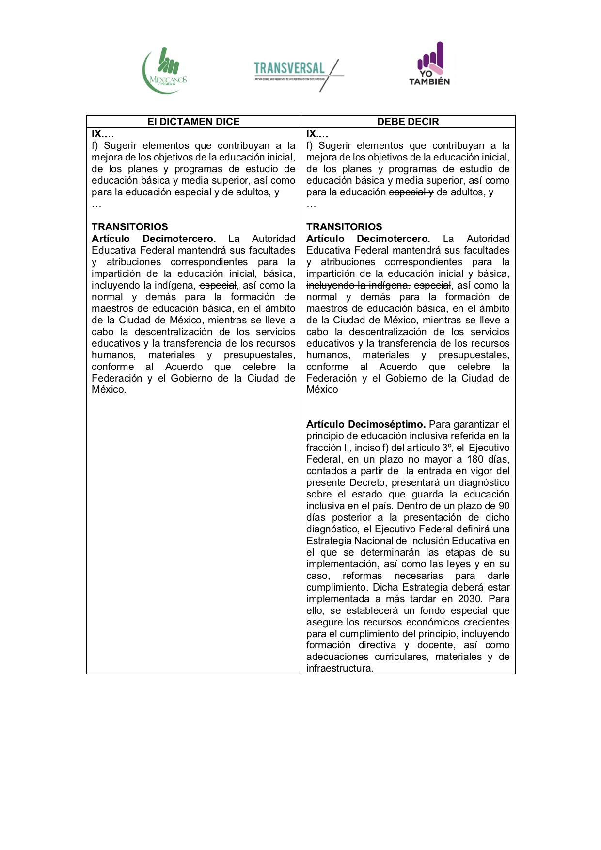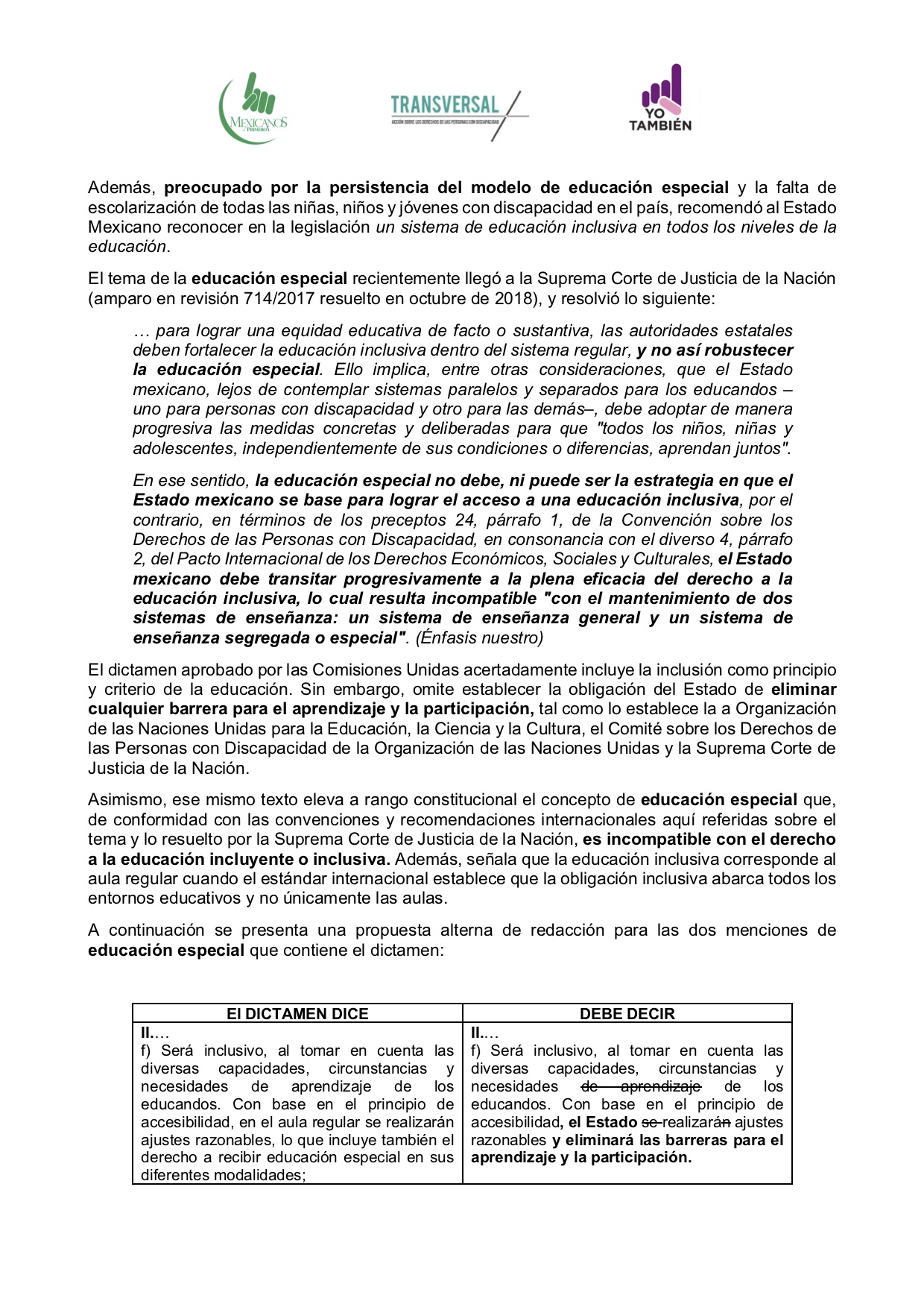 En el documento se presenta una alternativa de redacción para evitar retrocesos y avanzar en la comprensión y garantía del derecho a la educación incluyente para todas las niñas, niños y jóvenes (NNJ) en México.